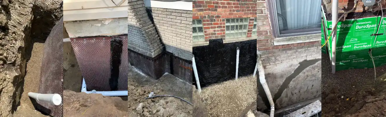 The examples below show exterior foundation waterproofing in progress, including coating, crack repair, drainage installation, membrane protection, and other steps used to help stop water before it reaches the structure.